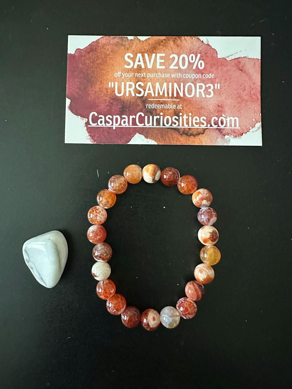 The Fire Agate crystal beads are 8mm in diameter. The crystal bracelet itself measure approximately 7 inches long, unstretched, and one size fits most.
