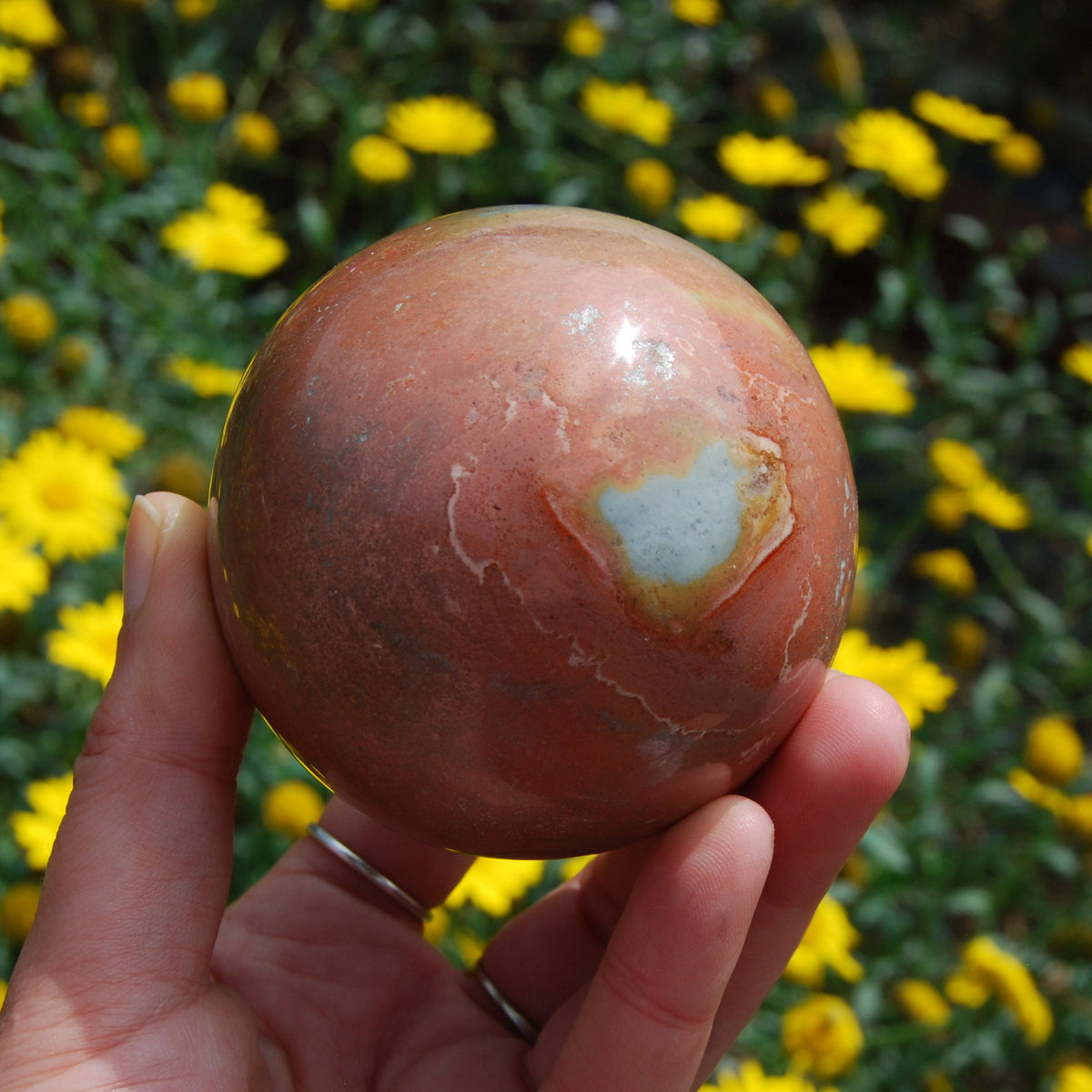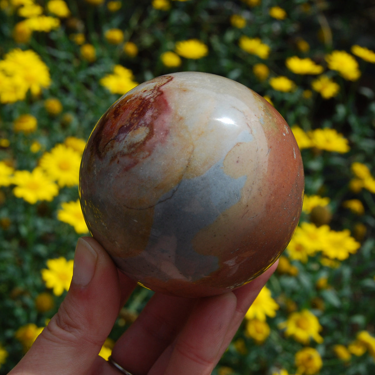 For your consideration is this beautiful carved Polychrome Jasper crystal sphere from Madagascar. It is slightly irregular in shape. It weighs 553 grams (1.2 pounds) and measures approximately 3 inches in diameter.