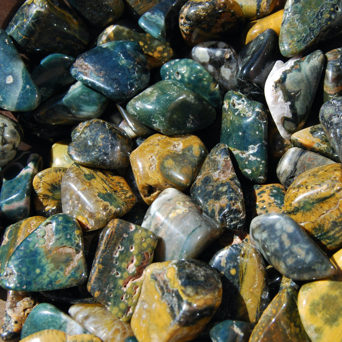 Natural medium Ocean Jasper tumbled stones from Indonesia. These pieces measure .75 to 1 inch.