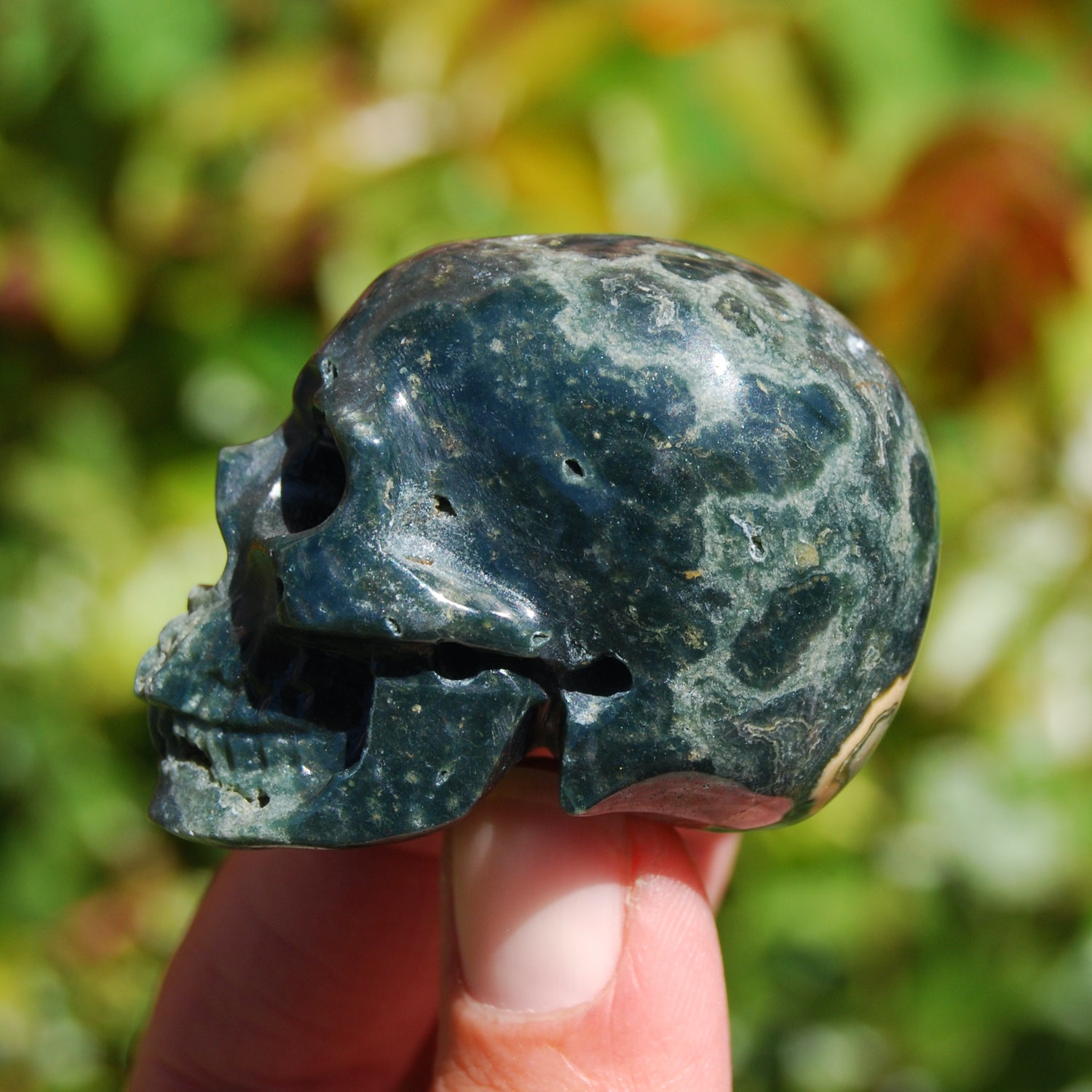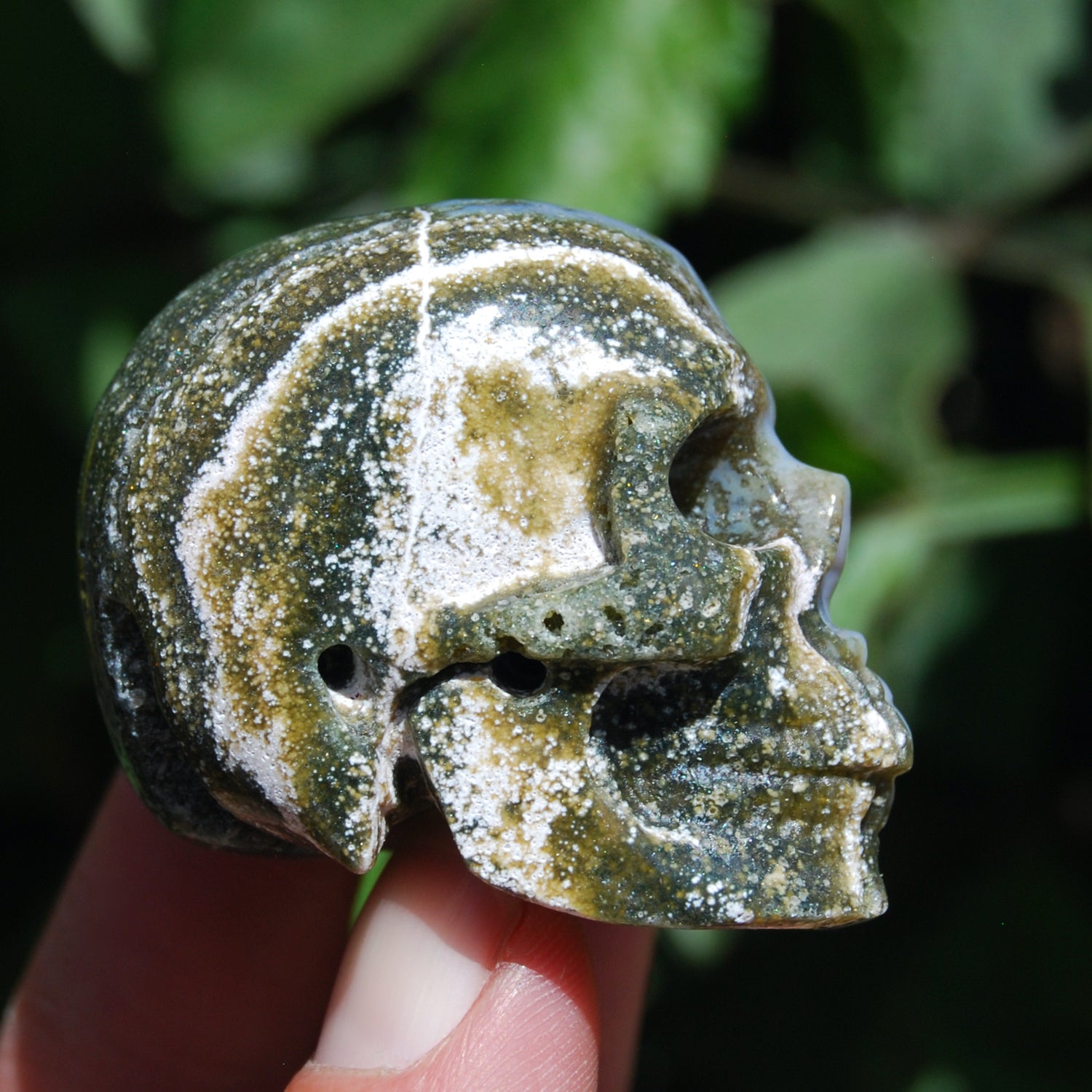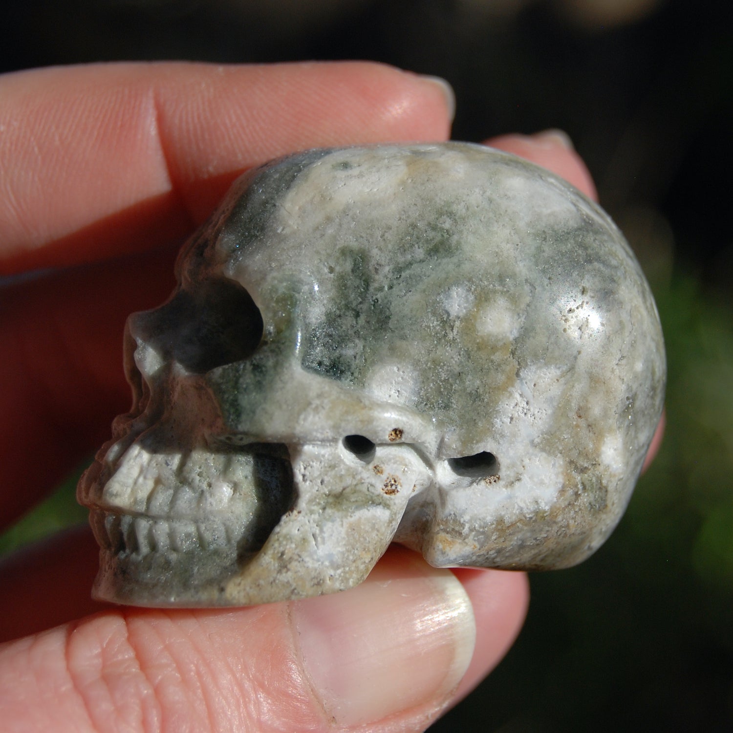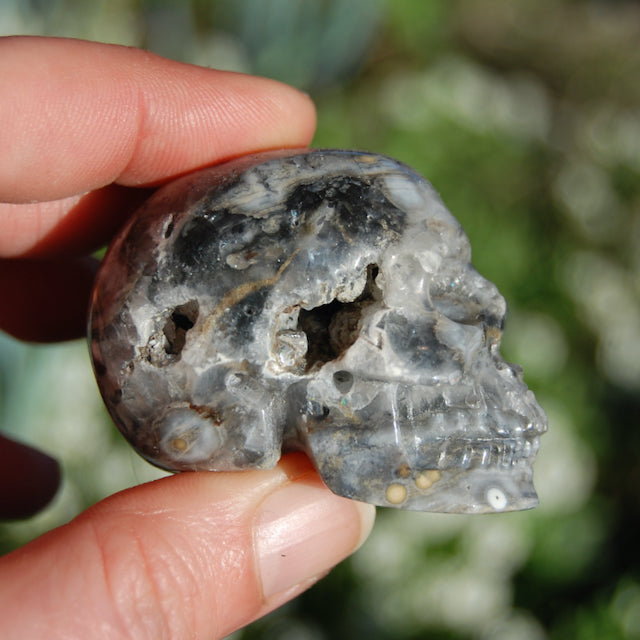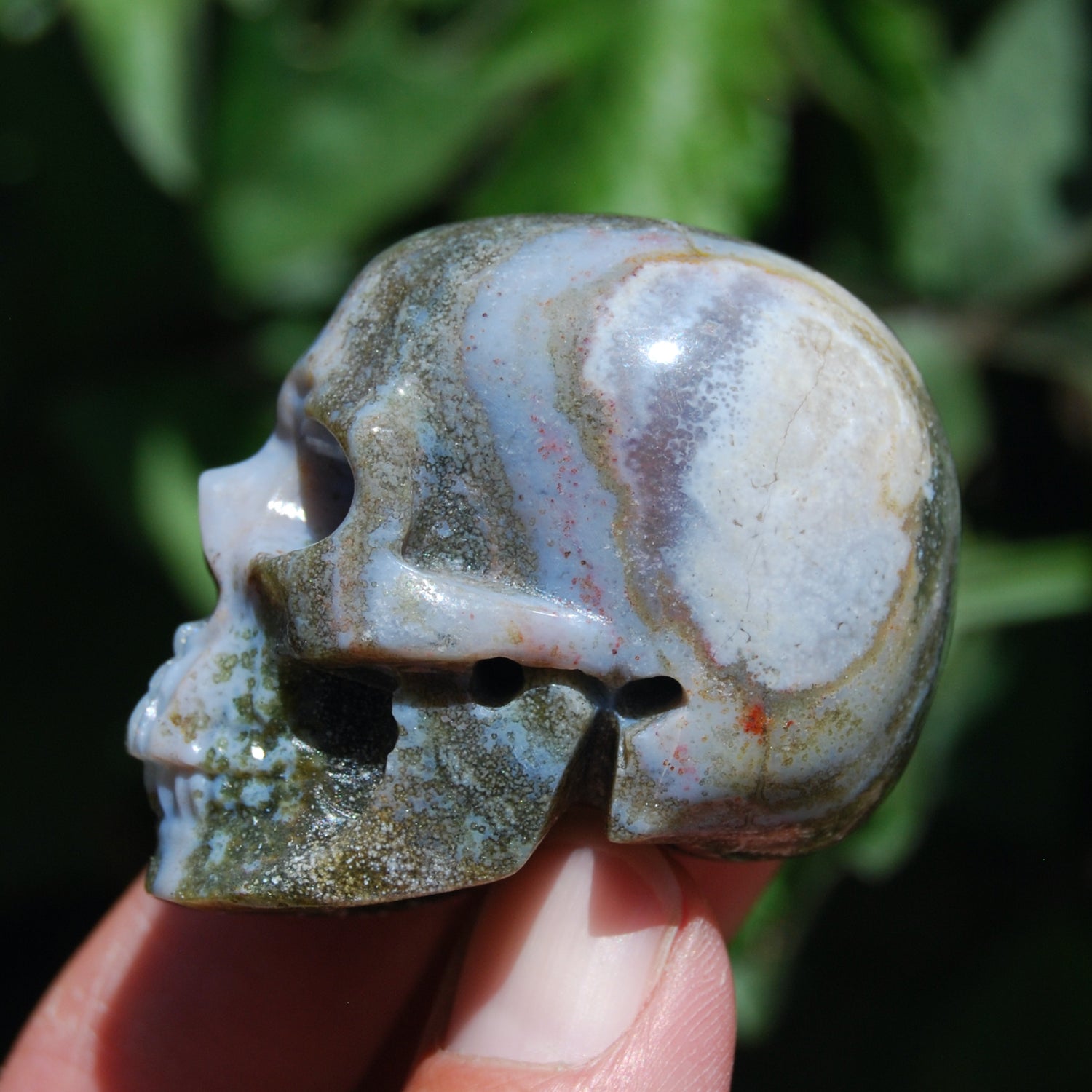 For your consideration is this high quality hand carved Ocean Jasper crystal skull. The one pictured is the one you will receive. It measures approximately 2 inches long and 1.5 inches tall.