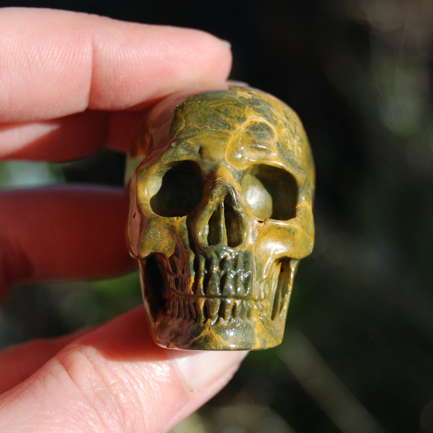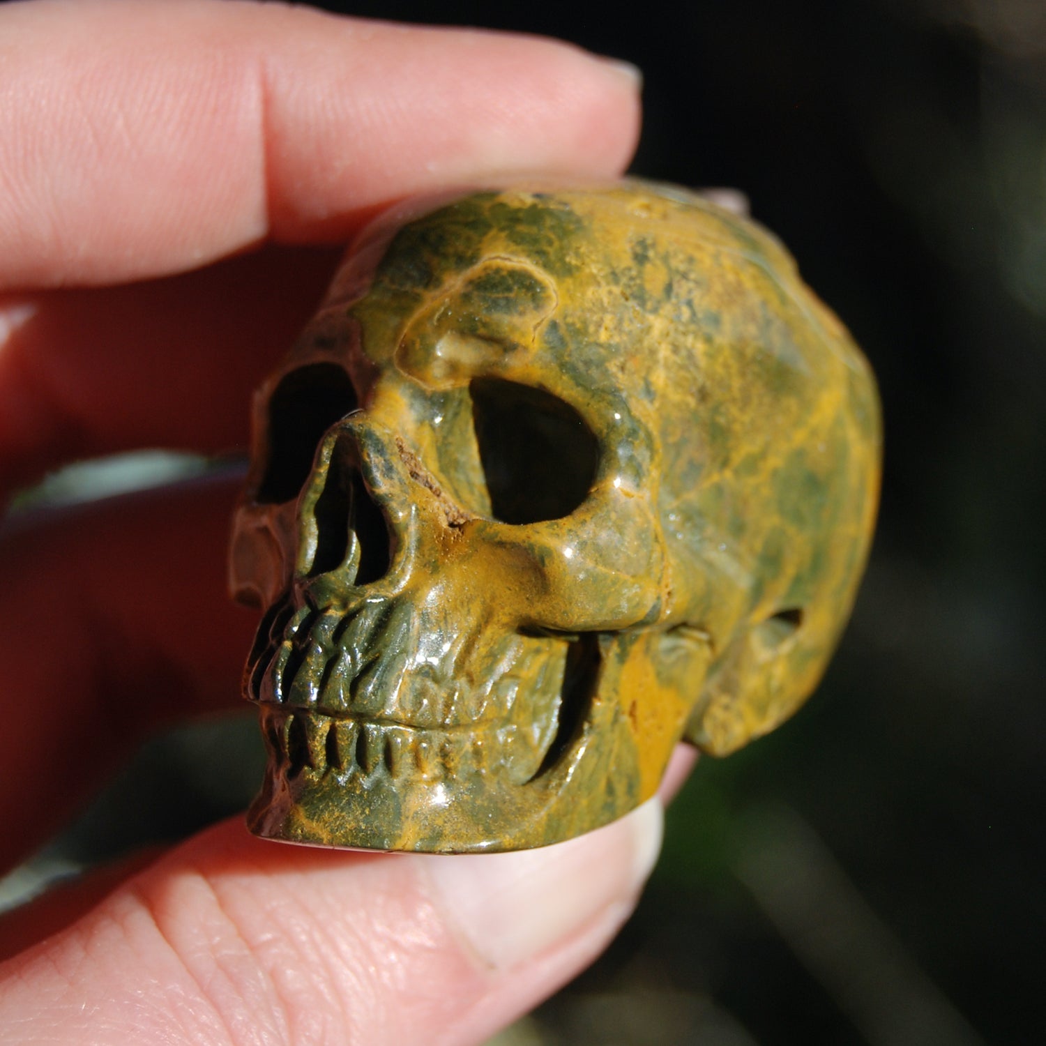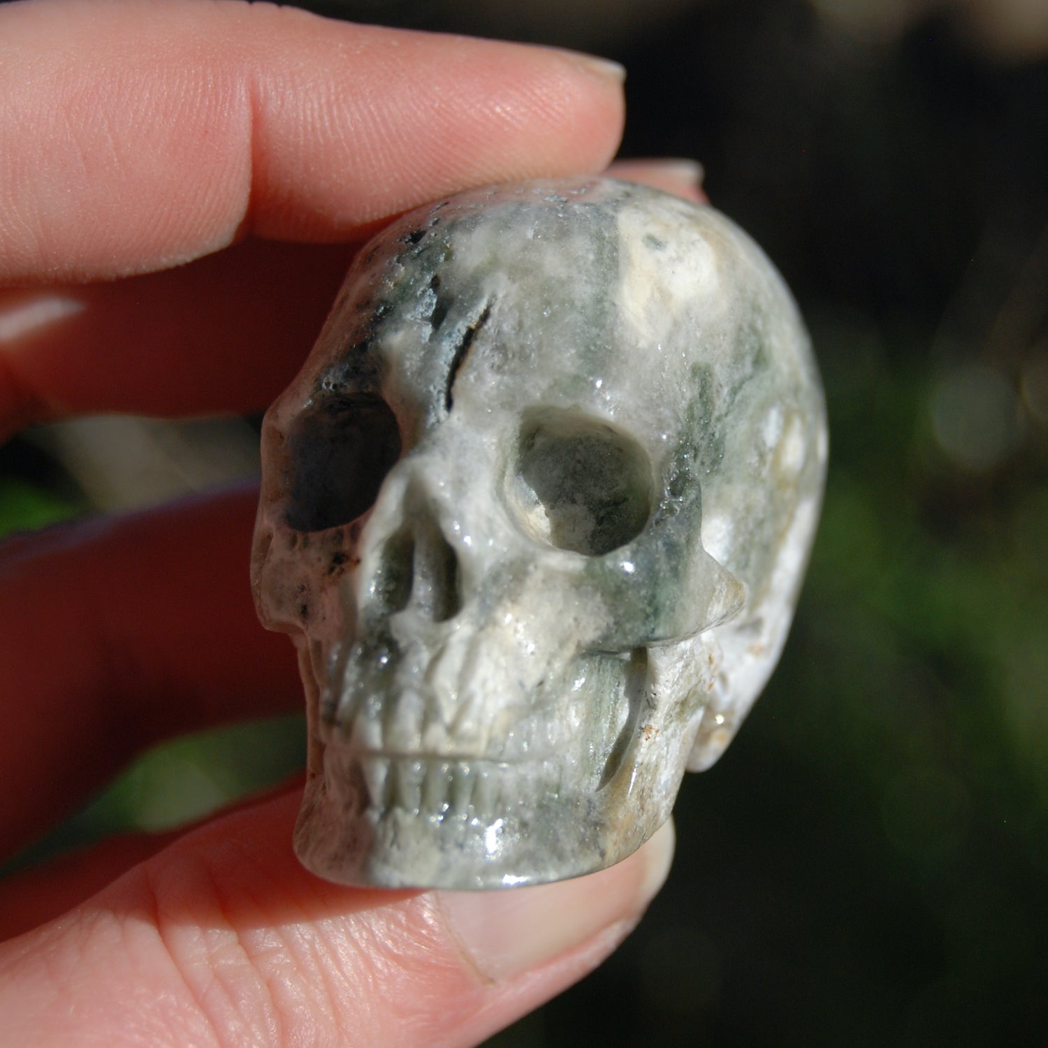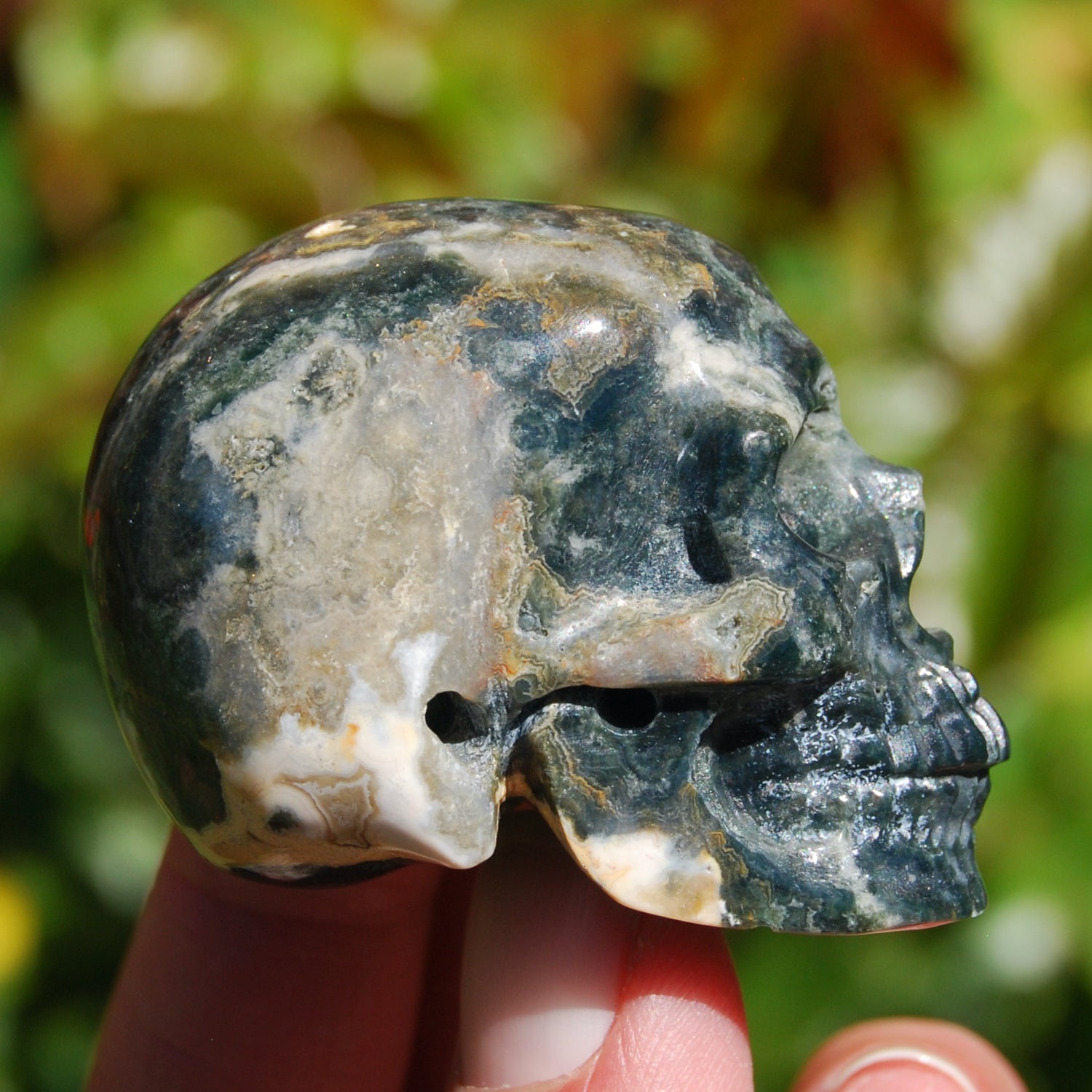 For your consideration is this high quality hand carved Ocean Jasper crystal skull. The one pictured is the one you will receive. It measures approximately 2 inches long and 1.5 inches tall.