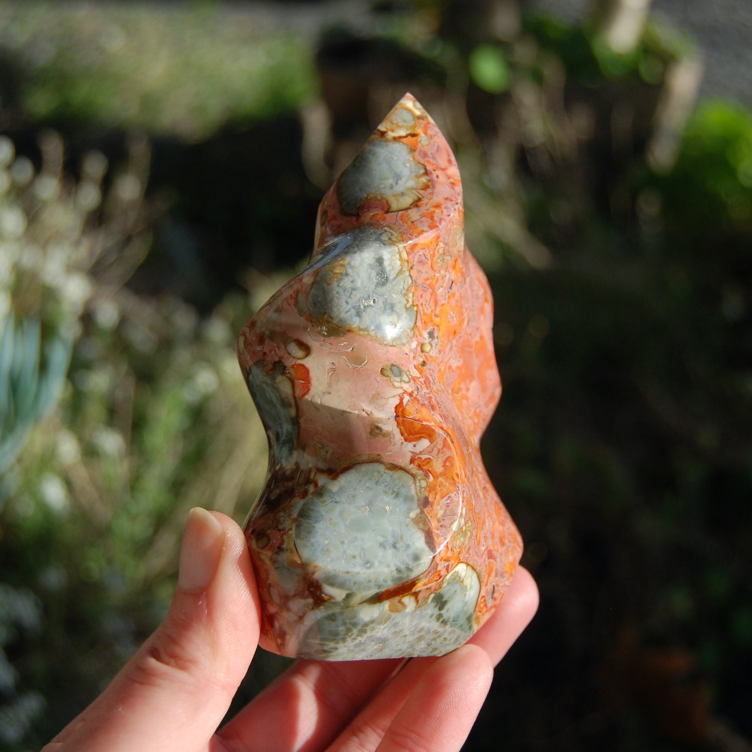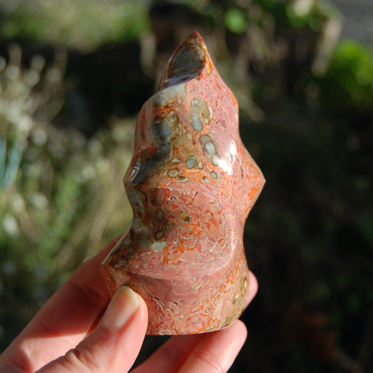 For your consideration is this beautiful carved Polychrome Jasper crystal flame from Madagascar. It is self standing, weighs 429 grams and measures approximately 4.5 inches tall.