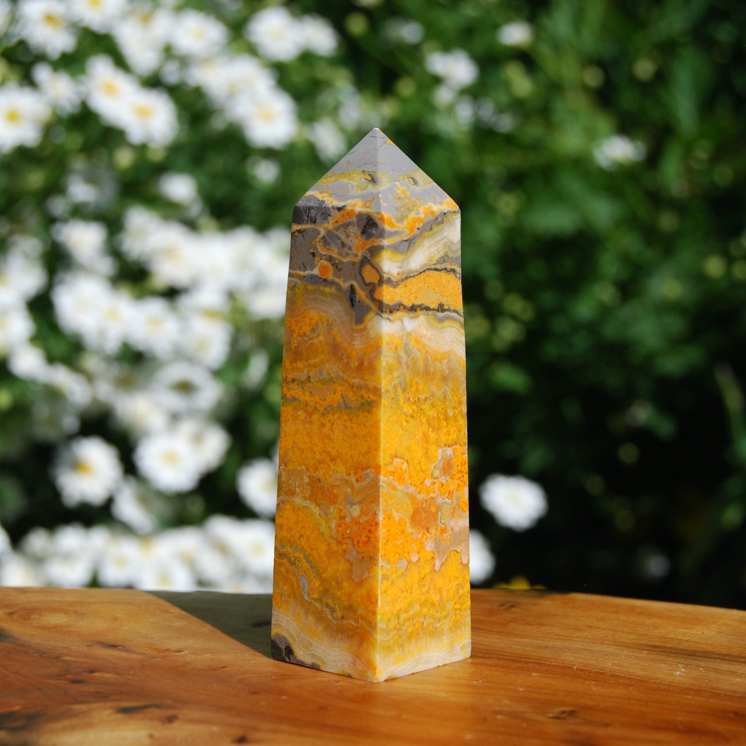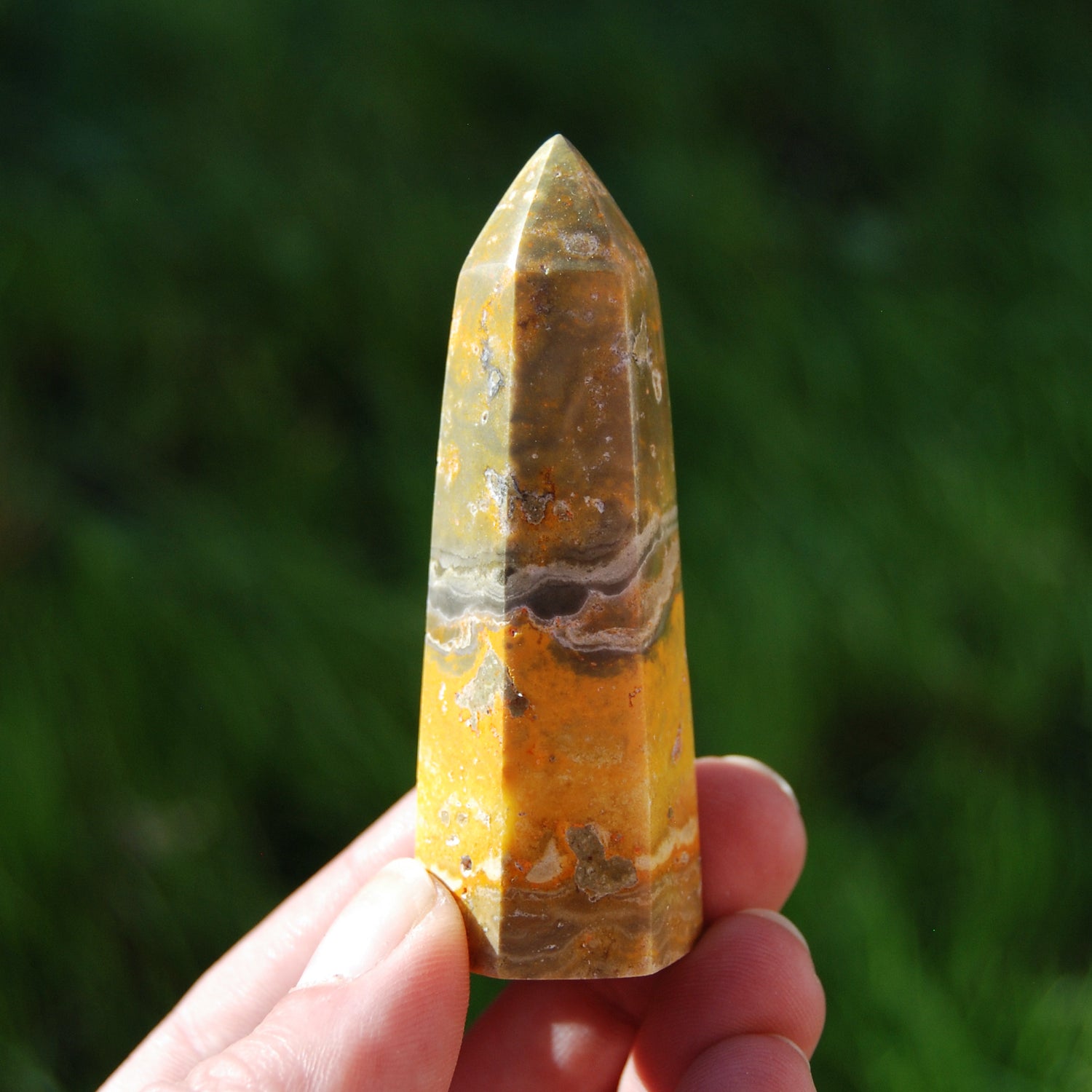 For your consideration is this very special and simply stunning Bumble Bee Jasper tower from Indonesia. It weighs 108 grams and measures approximately 3.5 inches tall.