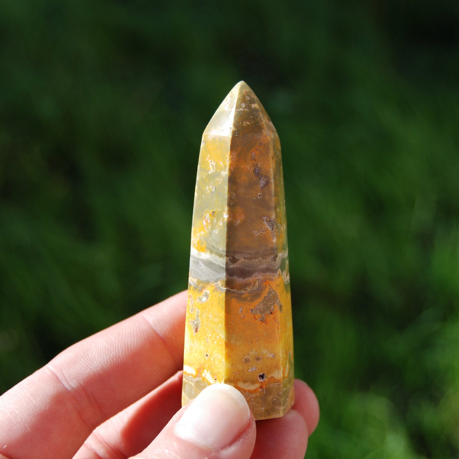For your consideration is this beautiful Bumblebee Jasper tower from Indonesia. It is self standing. This one weighs 60 grams and measures approximately 3 inches tall.
