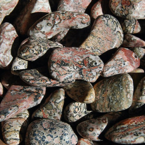 Natural medium pink Leopard skin Jasper tumbled stones from Mexico. These pieces measure .75 to 1.25 inches.