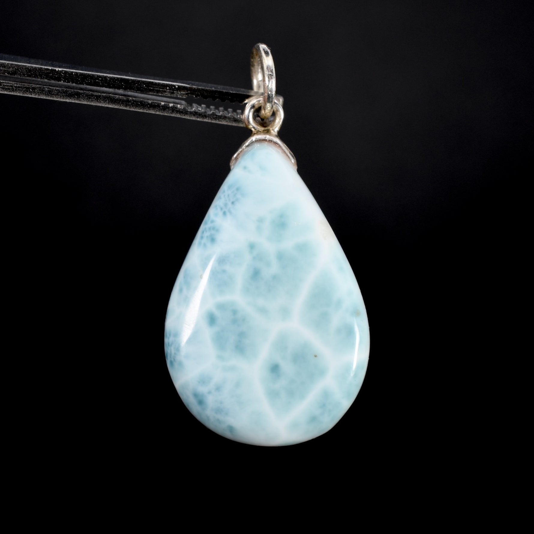 The Larimar crystal pendant pictured is the one you will receive. It weighs 66 carats and measures approximately 1.7 inches from the top of the silver bail to the bottom of the drop. The measurement of the Larimar crystal drop, not including the bail, is 33mm tall, 23mm wide and is 9mm thick.