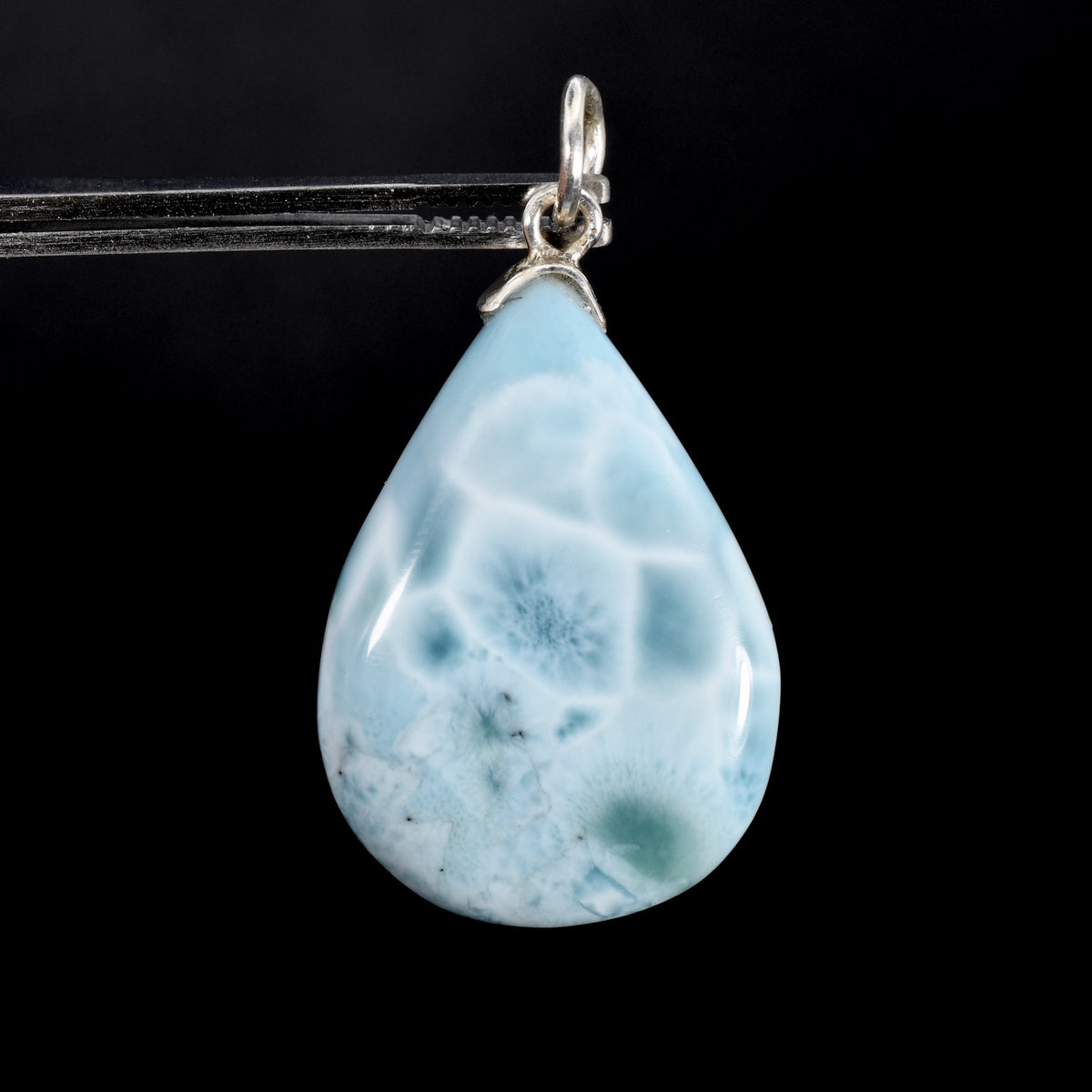 For your consideration is the beautiful genuine Larimar pendant from the Dominican Republic. It is double sided, so you can wear it two ways, and is suspended from a strong sterling silver bail. The bail has been drilled into the stone and then further enforced with a bit of jeweler's resin.
