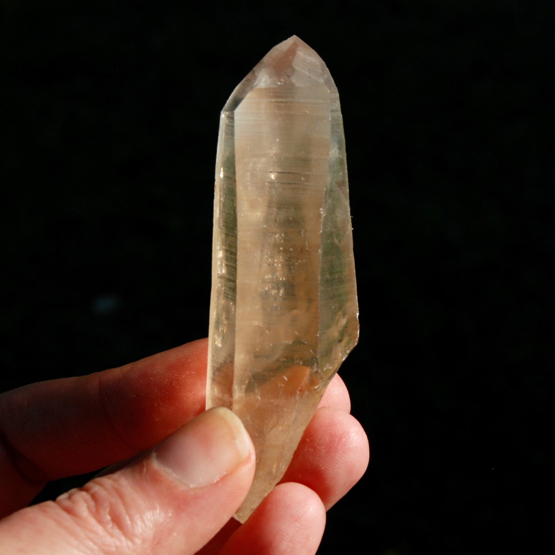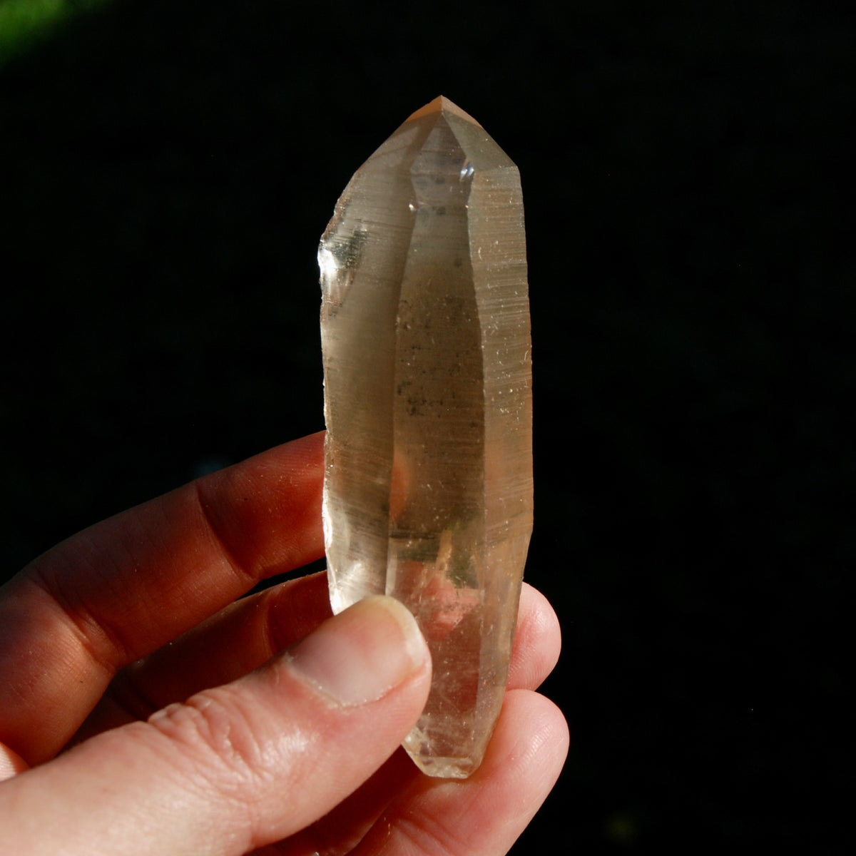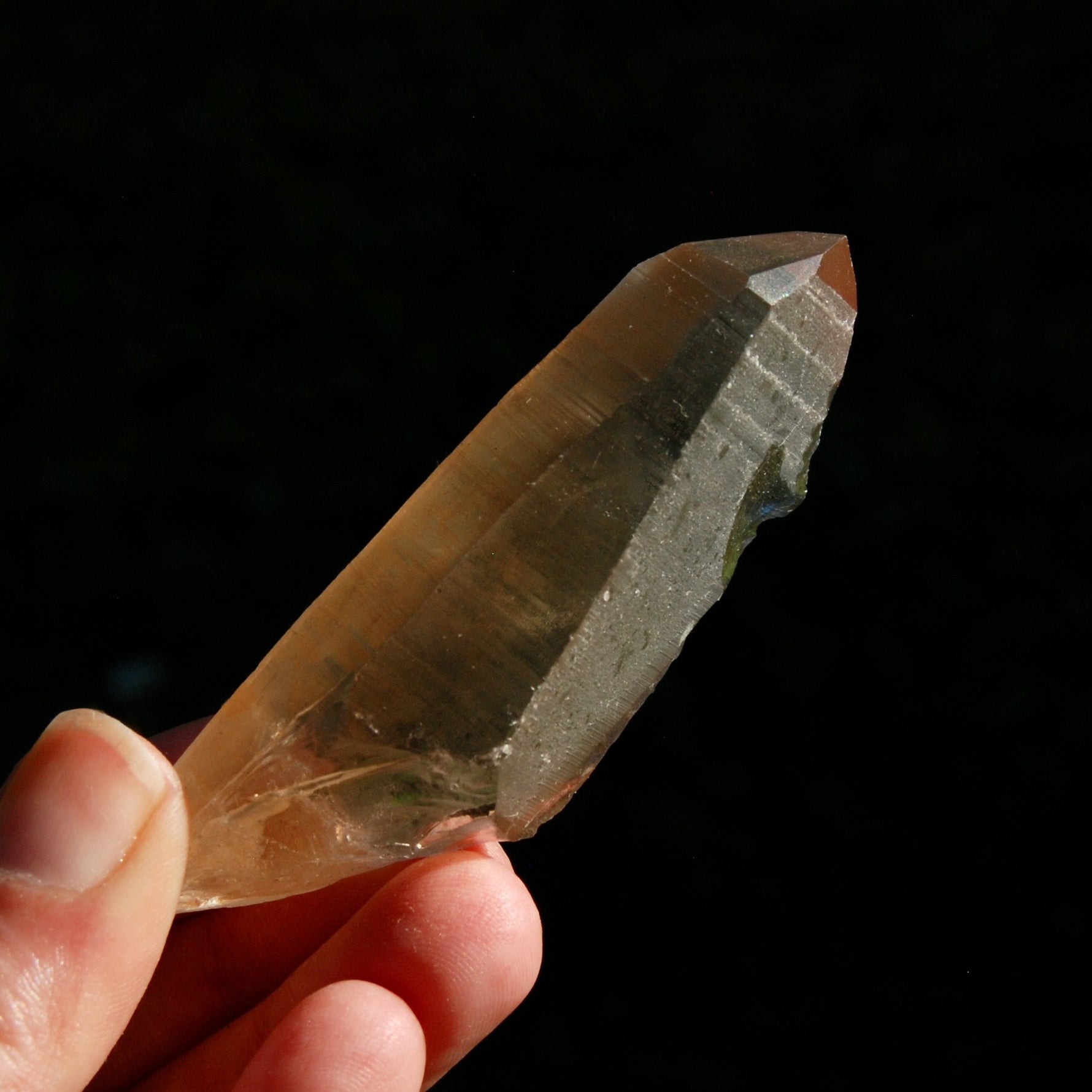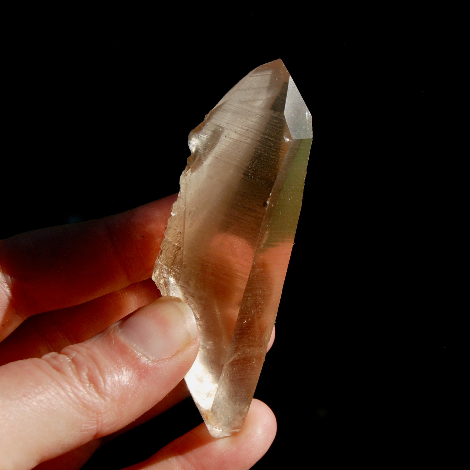 The smoky Pink Shadow Lemurian quartz crystal pictured is the one you will receive. It has a large, perfect Isis Face with growth interference, gorgeous clarity, deeply etched Akashic Lines and gorgeous glyphs making this a Starbrary correlating to the constellation of Cassiopeia (the Explorers). There is dow one edge of the shaft and the termination has been polished a bit. This Pink Shadow Lemurian crystal measures approximately 3.3 inches long and weighs 66 grams (0.15 pound).
