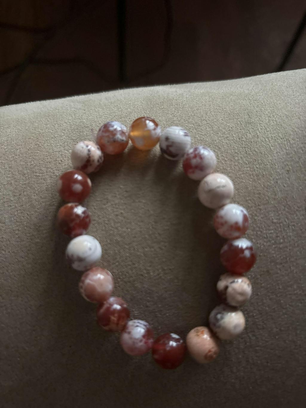 The Fire Agate crystal beads are 10mm in diameter. The crystal bracelet itself measure approximately 7 inches long, unstretched, and one size fits most.