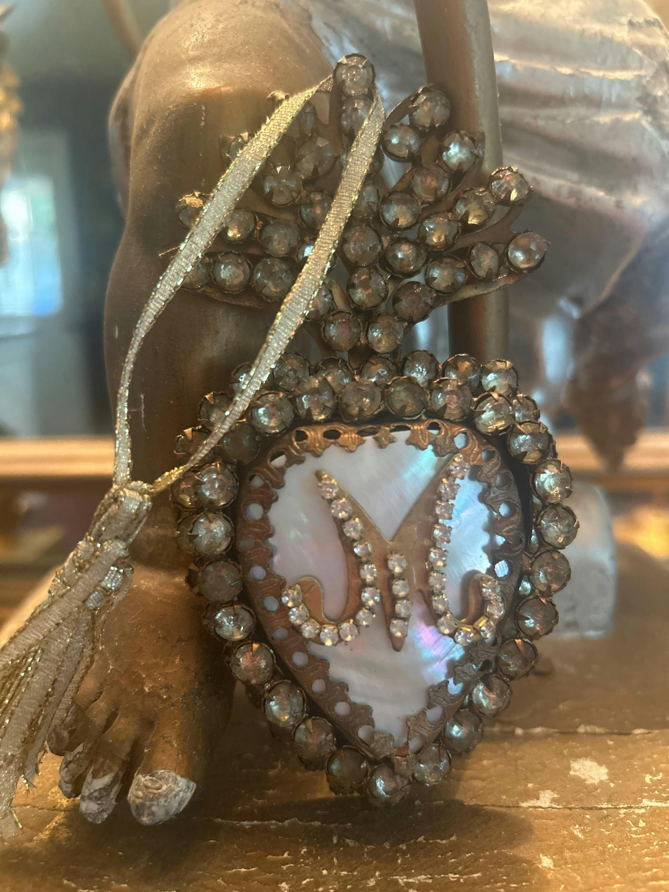 5.5" Sacred Heart Ex Voto Locket Ornament Mother of Pearl Rhinestone