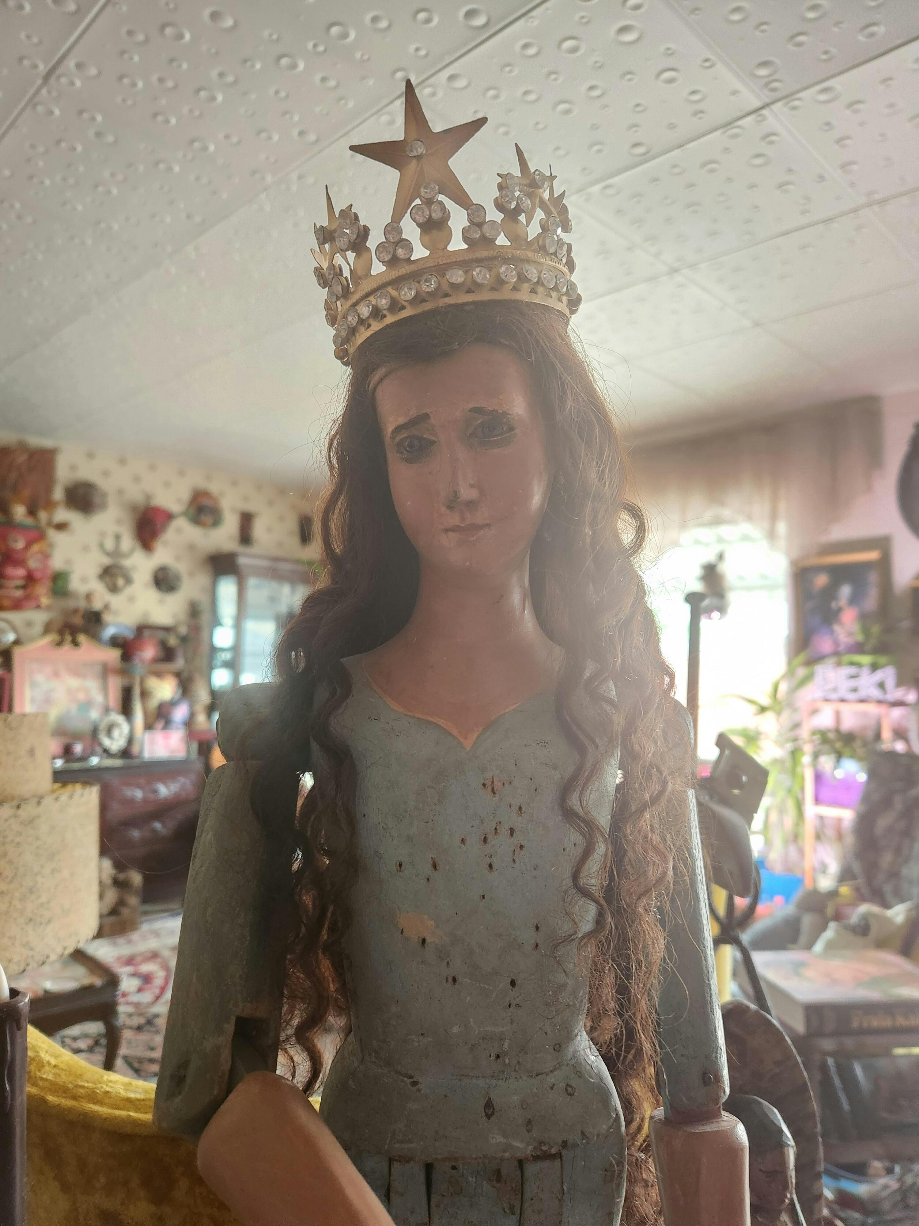 For your consideration is this shabby chic santos crown. It is made of antique gold toned metal with a motif of stars studded with rhinestones.