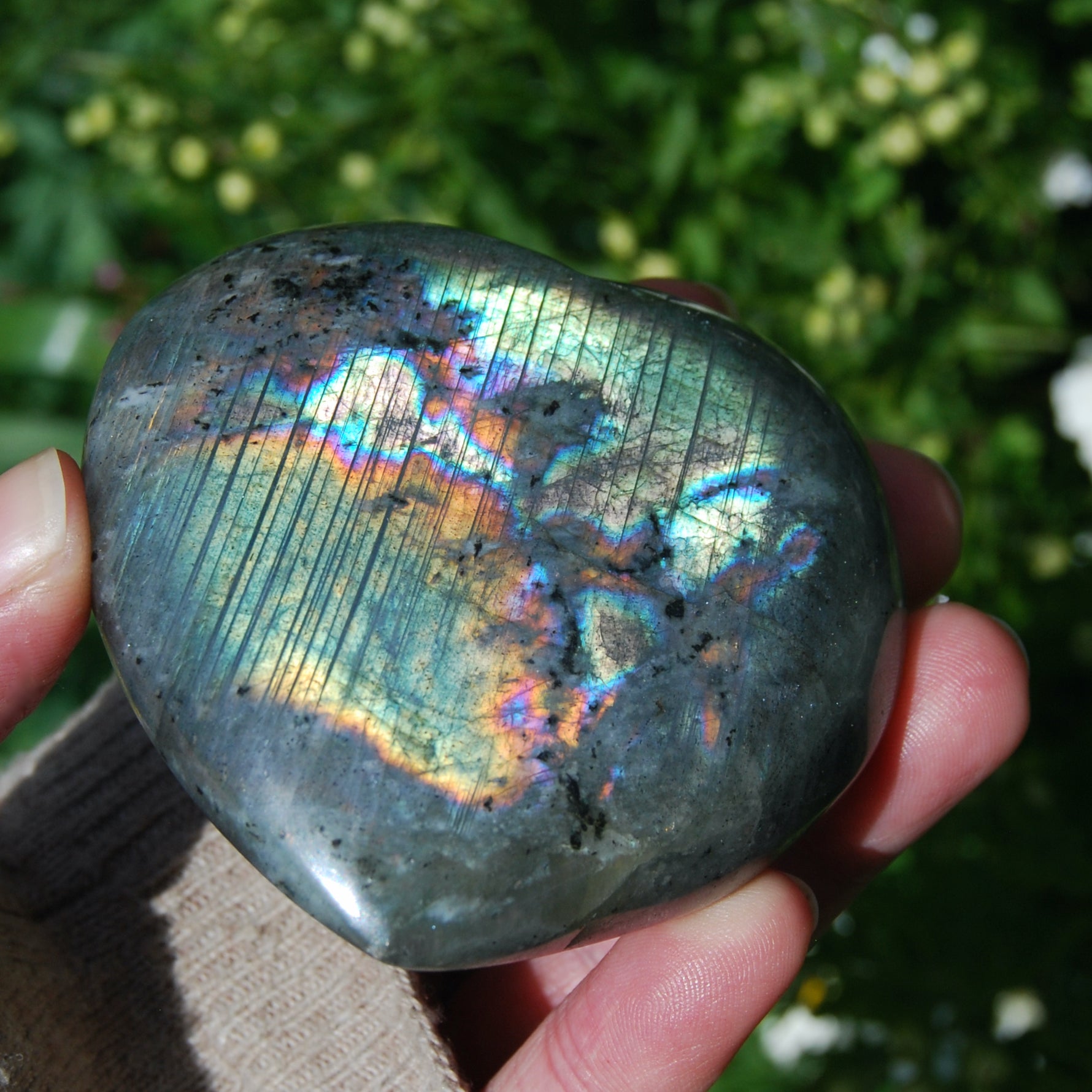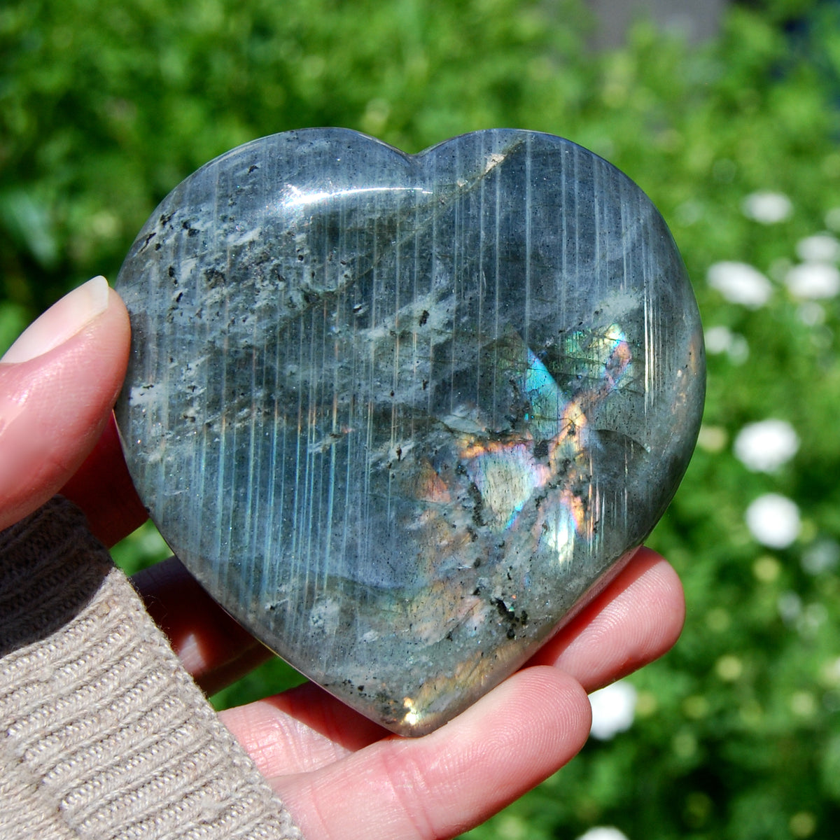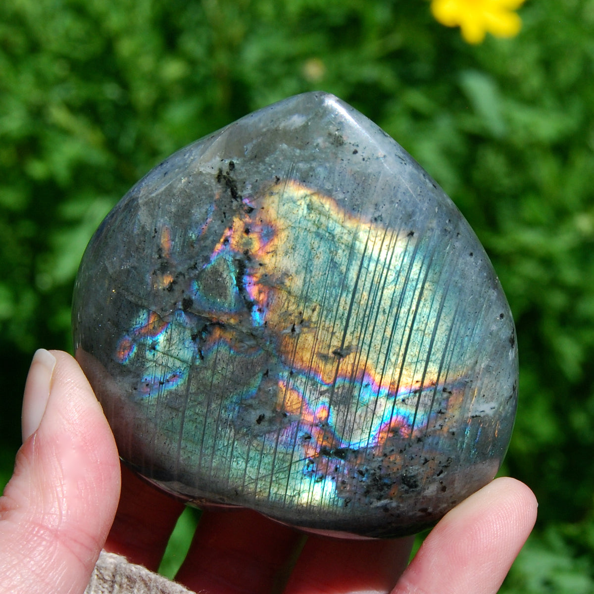 Unit price / perFor your consideration is this large, super flashy, Labradorite heart shaped crystal palm stone. It measures approximately 3 inches tall and weighs 208 grams. The one pictured is the one you will receive. This one has a lot of areas of rare purple, lavender and pink.